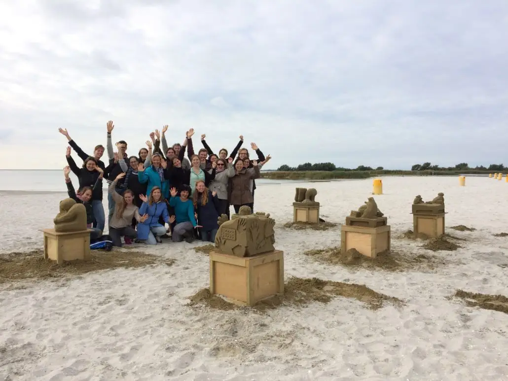 Creative teambuilding activity where teams create impressive sand sculptures together on the beach.